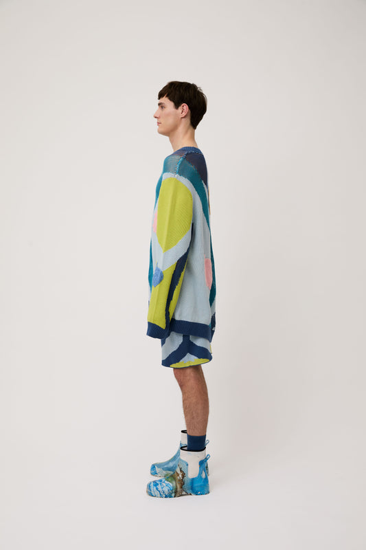 Blue Embroidered Leaf Sweater & Botanical Jacquard Knit Shorts