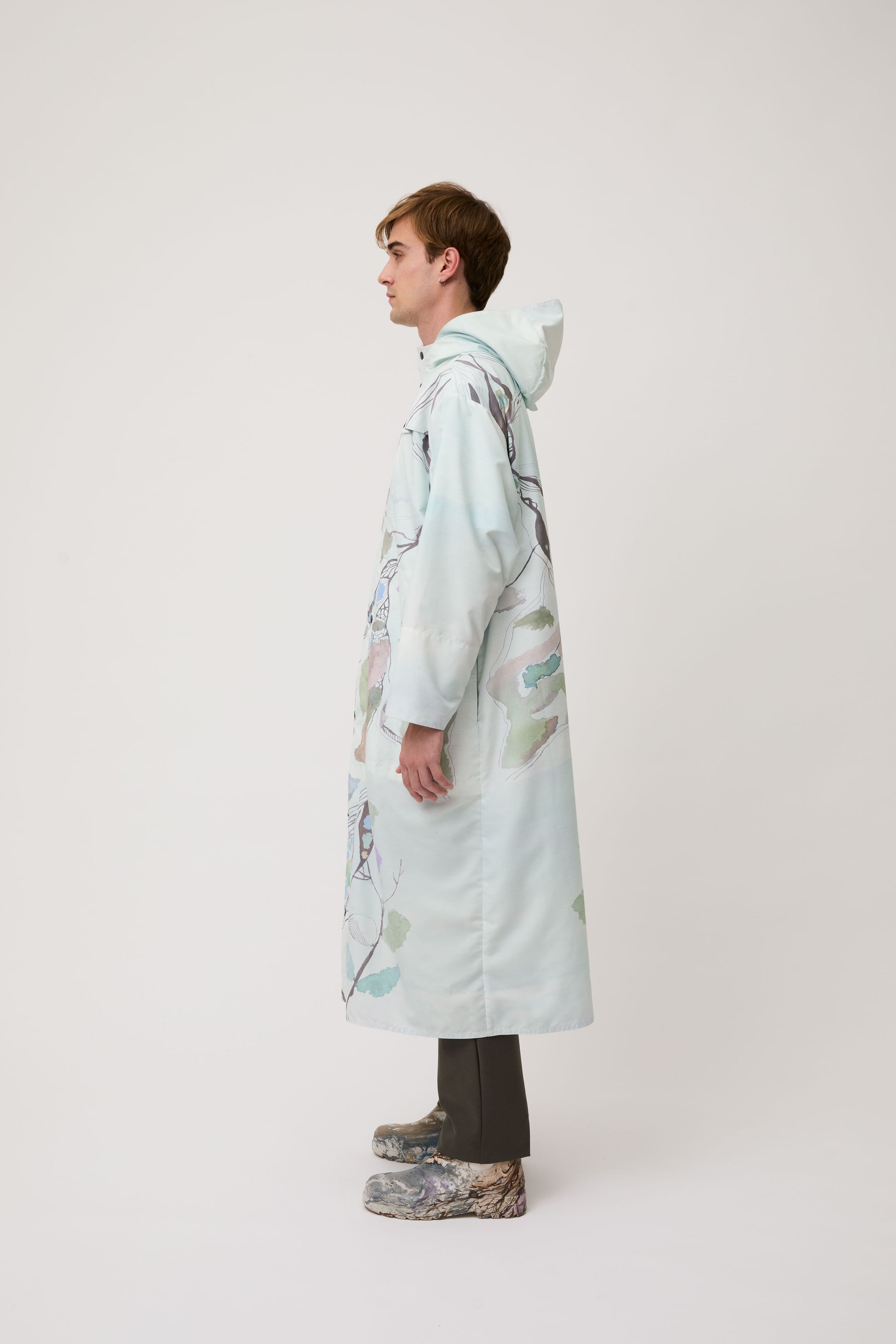 A lightweight full-length coat in soft pastel blue with hand-drawn abstract brushstroke floral patterns. Featuring a hood and snap buttons.