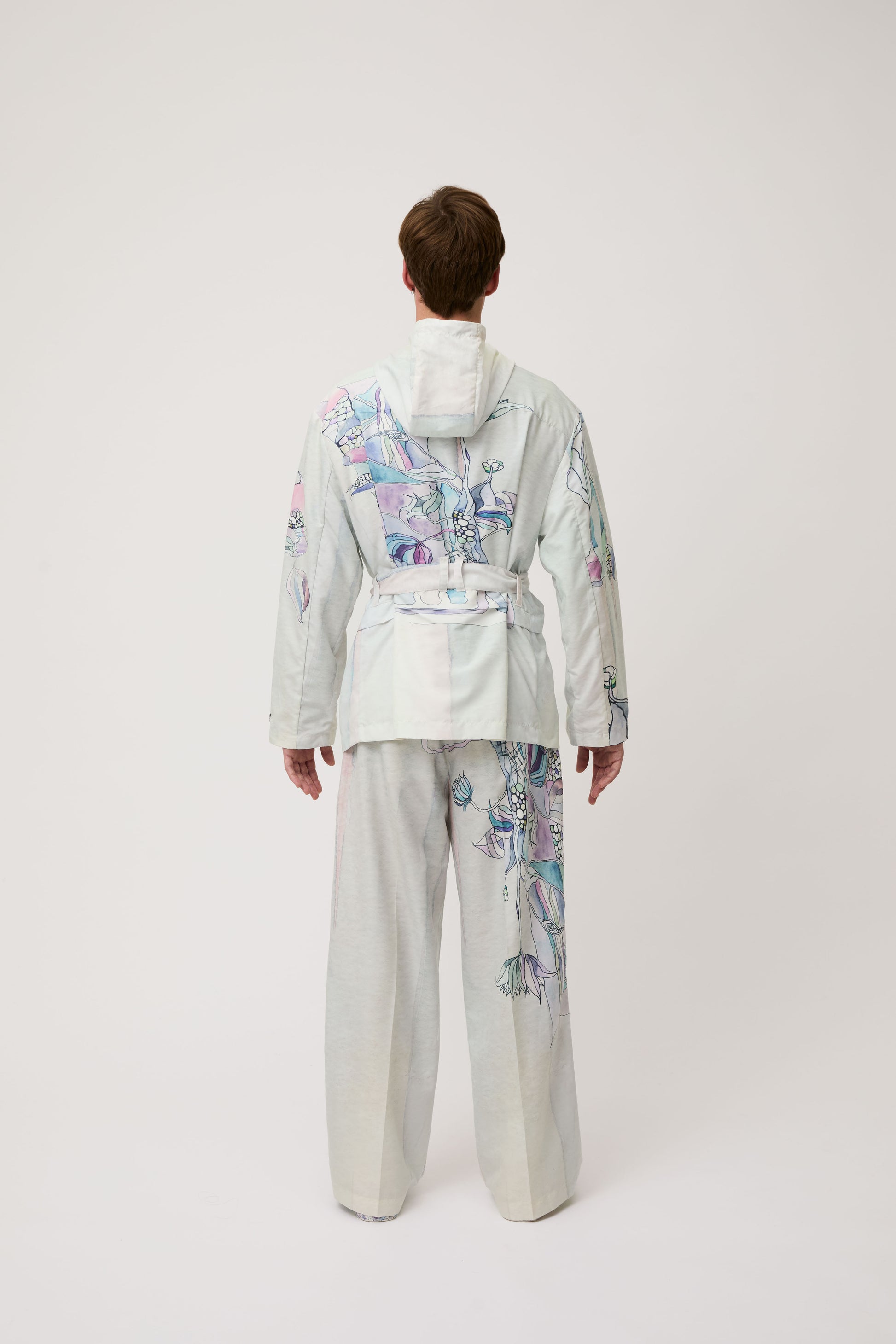 A light belted jacket with pastel botanical motifs. Featuring a front zip and adjustable sleeve straps. Perfectly complementing the matching Irisflow Trousers.